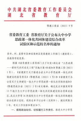 近日,湖北省委教育工委、省教育厅公布了大中小学思政课一体化共同体建设综合改革试验区和示范校名单,米兰官网成功入选湖北省大中小学思政课一体化共同体建设综合改革示范校名单。